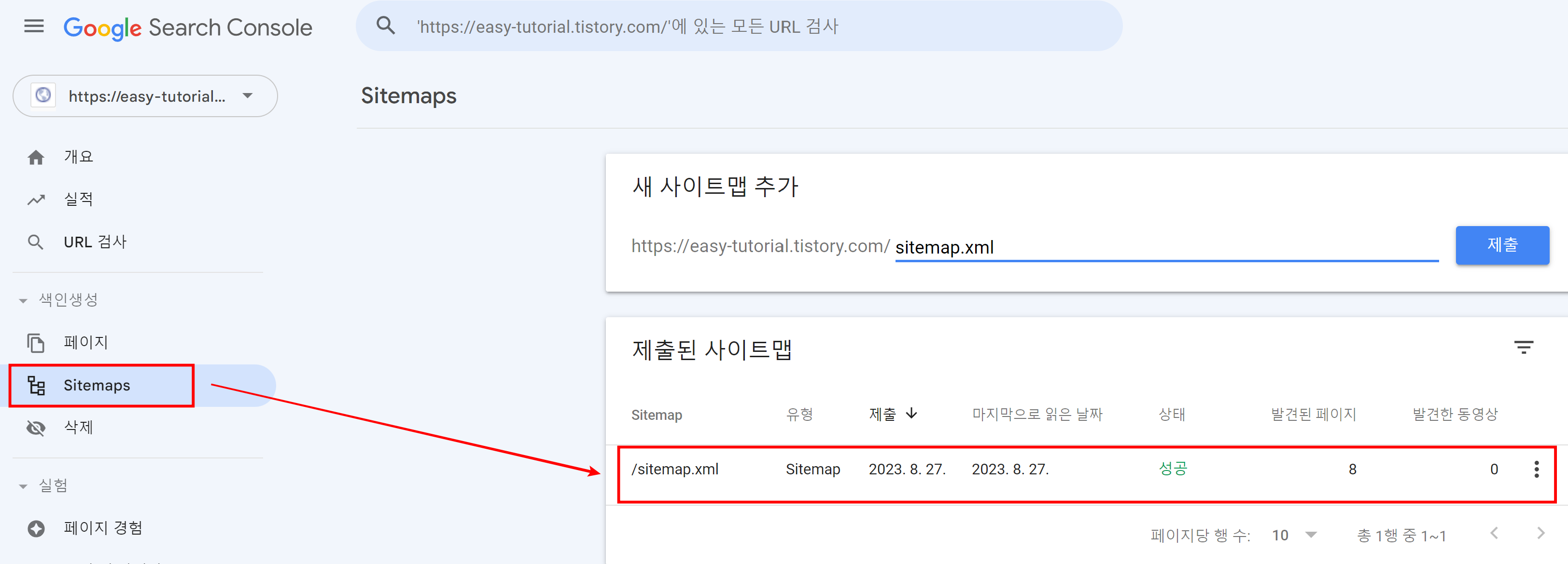 이렇게 적용하시면 자동으로 sitemap/xml이 자동으로 제출되었을 것입니다. 서치콘솔 바로가기를 클릭해 줍니다.