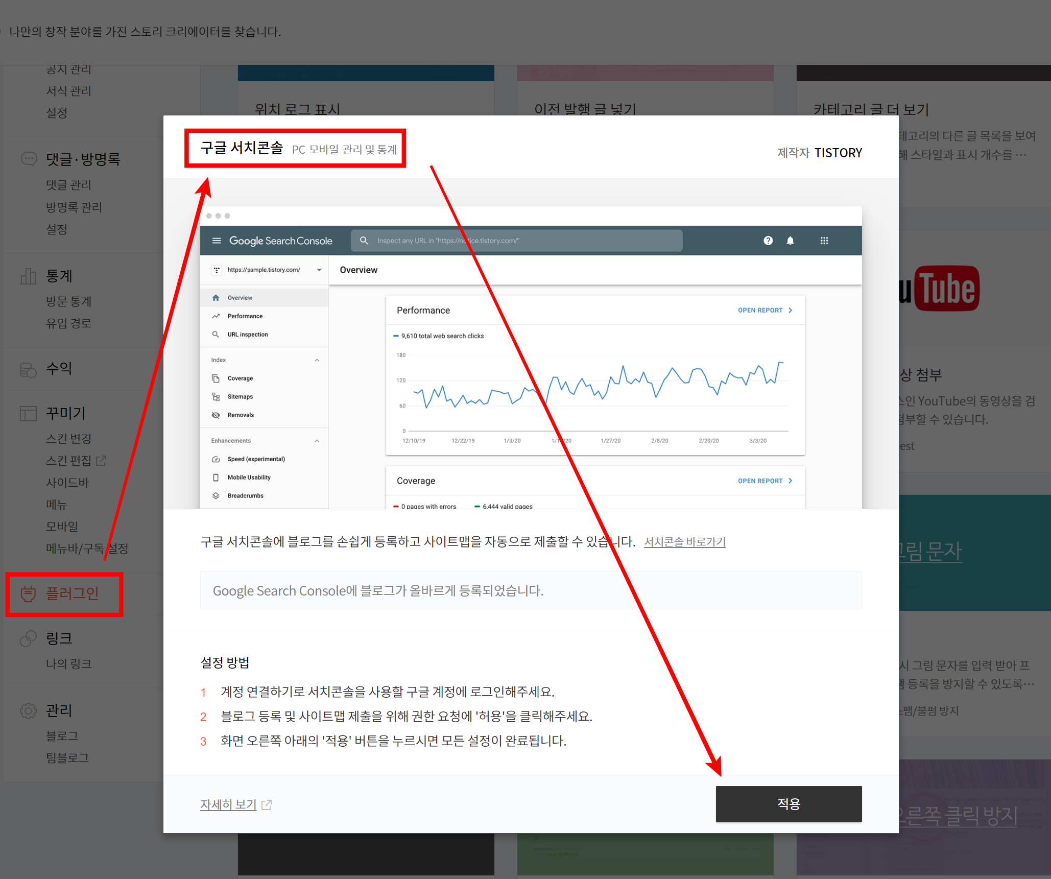 블로그 관리 홈에 플러그인을 클릭하시고 구글 서치 콘솔을 등록해 줍니다.